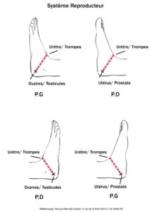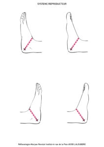 Cette planche illustre les zones réflexes associées au système reproducteur sur les pieds, selon les .