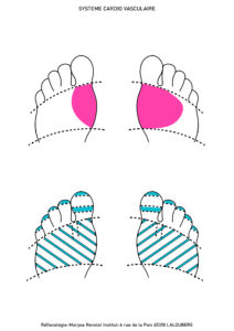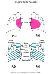 Cette planche présente les zones réflexes associées aux systèmes cardio-vasculaire et respiratoire sur les pieds, selon les .