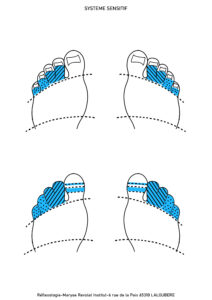 Nez : Représentés sur le milieu du gros orteils (zones bleues pointillées).