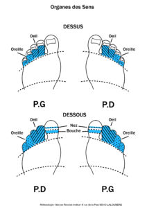 Cette planche présente les zones réflexes associées aux organes des sens sur les pieds, selon les .